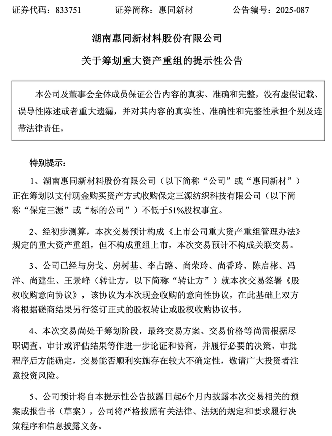 惠同新材正在筹划重大资产重组计划,计划通过现金方式收购保定三源不低于51%的股权,此次收购旨在整合资源,扩大业务范围,提高市场竞争力,该计划一旦实施,将对惠同新材的业务发展和市场地位产生积极影响,具体收购细节和后续整合计划将在后续公告中披露。