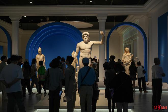 记者现场看到,在一楼“文明的史诗——来自地中海的古典雕塑艺术展”门口,游客们排起长队,室内灯光映照着洁白的雕塑,仿佛穿越至两千年前的地中海文明。史天琦介绍,展览以公元前8世纪至公元4世纪的古希腊古罗马文明为背景,呈现了125件精美展品。