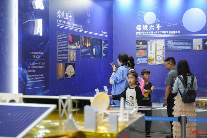 10月4日一早,四川科技馆门口就已排起长队,入馆处人头攒动。顺着人流走进一楼西厅,“九天揽月”展厅里人气爆棚,小朋友们围着展柜探头张望,不少家长干脆半蹲下来,为孩子讲解“嫦娥五号”“嫦娥六号”的登月故事。