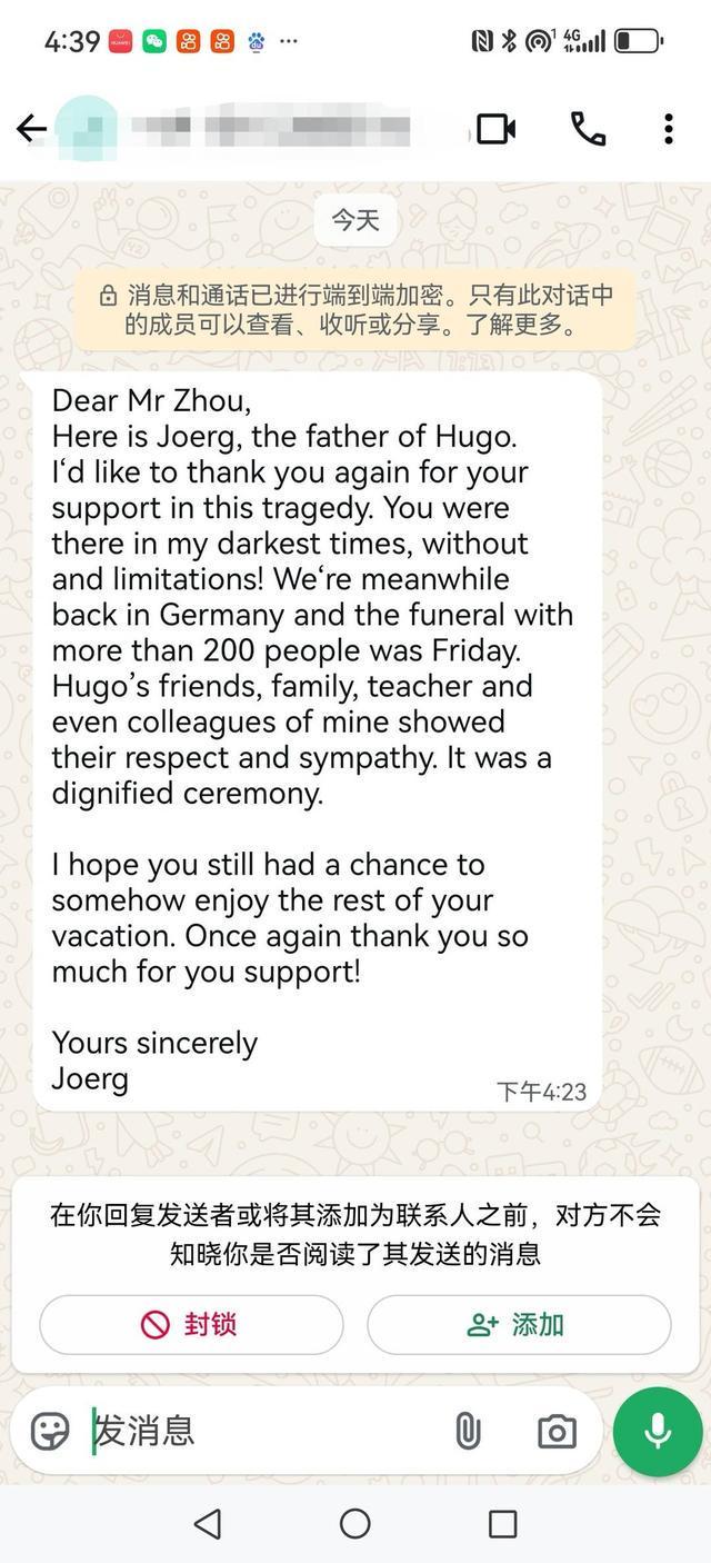 这份感谢信中写道,他们已经回到德国,并给儿子准备了葬礼。男子父亲两度感谢了周先生,称“感谢您在这次悲剧事件中给予的支持,您在我最黑暗的时刻给予无条件的陪伴!”