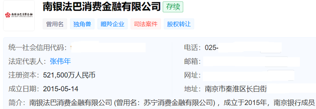 天眼查显示,南银法巴消金成立于2015年5月14日,注册资本为52.15亿元,目前的法定代表人是张伟年。