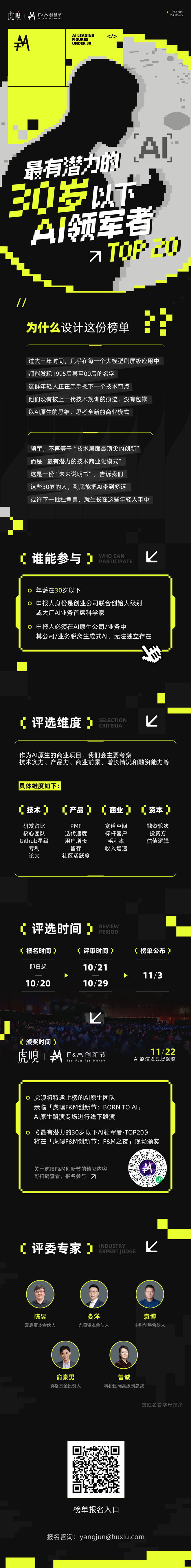 因此,虎嗅科技组“AI原生100”栏目正式发起《最有潜力的30岁以下AI领军者·Top20》榜单。
