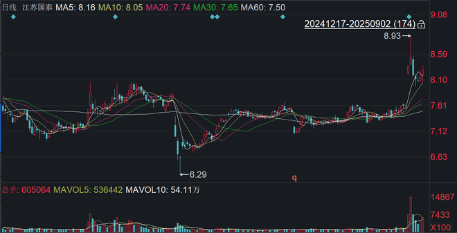 二级市场上,截至9月3日9点45分,江苏国泰下跌0.12%报8.26元/股,最新市值134.44亿元,近一年公司股价上涨约三成。
