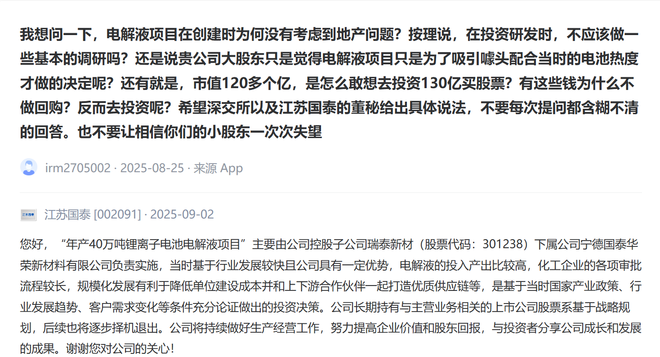 “市值120多个亿,是怎么敢想去投资130亿买股票?”——8月25日,一名投资者在深交所互动易平台向江苏国泰(002091)发出“灵魂叩问”,直至9月2日公司才做出回应称,公司长期持有与主营业务相关的上市公司股票系基于战略规划,后续也将逐步择机退出。