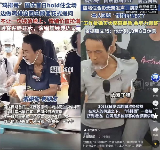 蓝鲸新闻10月5日(记者 汤诗韵)因为情绪价值饱满而爆火的"鸡排哥"大概是这个国庆长假最忙的人之一。假期过半,鸡排哥持续高强度营业了四天,被指"累到没有情绪价值"。在这个黄金周,又一个普通人被流量高高举起、层层围住。