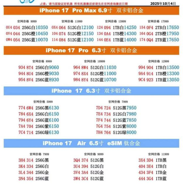 在远望数码商城,销售员老陈向蓝鲸科技记者出示的报价单显示,512GB版iPhone 17报价为7950元,同容量iPhone 17 Pro为10700元,而顶配2TB版iPhone 17 Pro Max价格高达17650元。尽管部分热门机型仍存在30至450元不等的溢价,但相比9月19日首发时全线溢价400–1300元的局面已明显回落。