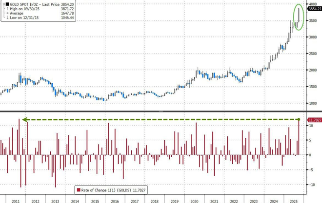 9月,黄金录得10%以上累计涨幅,创十四年最大月度涨幅。
