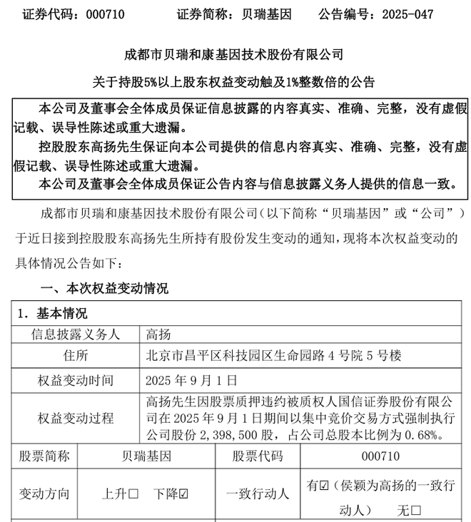 9月2日,贝瑞基因(000710)发布公告,控股股东高扬因股票质押违约,于2025年9月1日通过集中竞价交易方式强制执行其所持股份240万股,占公司总股本的0.68%。