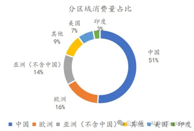 下游消费端,中国表观消费量占比超过50%,是绝对的消费核心,其余主要消费地为欧洲(16%)和美国(7%)。