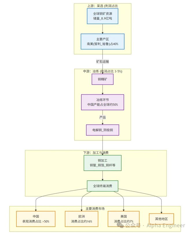 铜产业链呈现典型的“ 南美采矿-亚洲冶炼-全球消费 ”的地域分工模式。