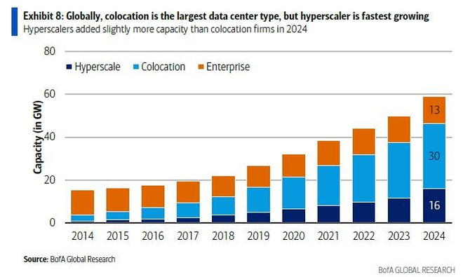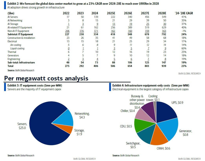 据美国银行(BofA)测算,全球数据中心资本支出在2024年已突破4000亿美元,2025年将达到5060亿美元,其中IT设备支出4180亿,基础设施支出880亿。在AI需求的驱动下,该市场预计在2024至2028年间,将以高达23%的惊人年复合增长率(CAGR)扩张,最终在2028年形成一个超过9000亿美元的庞大市场。