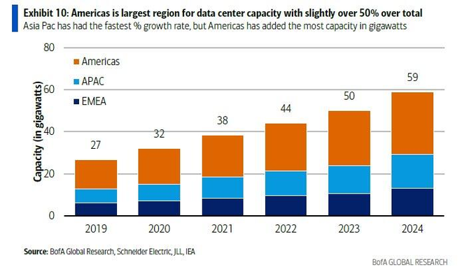 从全球产能分布来看,美洲地区占据了全球过半的电力容量,其中,美国东海岸的北弗吉尼亚州,以其近15%的全球超大规模数据中心容量,成为无可争议的全球最大单一聚集地。紧随其后的是咱们中国的北京,约占7%。
