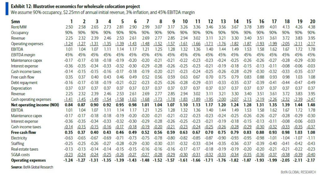 初始投资:建设一个1兆瓦(MW)容量的数据中心,土地、电力接入等前期成本约为200万美元,而包含建筑、机电、散热等设施在内的“动力外壳”(powered shell)成本约为1100万美元。合计每兆瓦的总投资约为1300万美元。