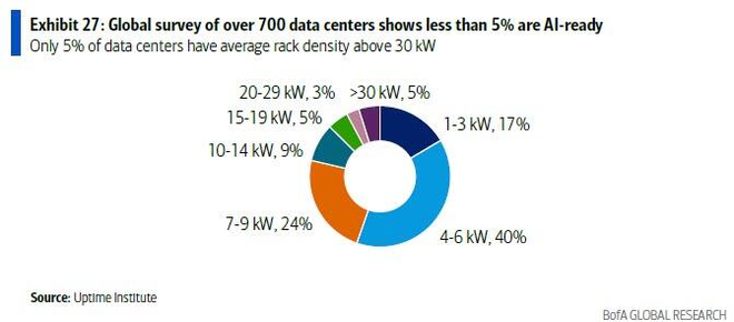 与此同时,全球存量数据中心基础设施建设却严重滞后。根据权威机构Uptime Institute在2024年的调查,全球仅有5%的现有数据中心,其平均机架密度能够超过30kW。这意味着,95%的数据中心甚至无法支持英伟达上一代的Hopper芯片,更不用说功耗更高的Blackwell。因此,AI算力的部署,必须依赖于一场对现有数据中心的大规模升级改造和海量的新建。