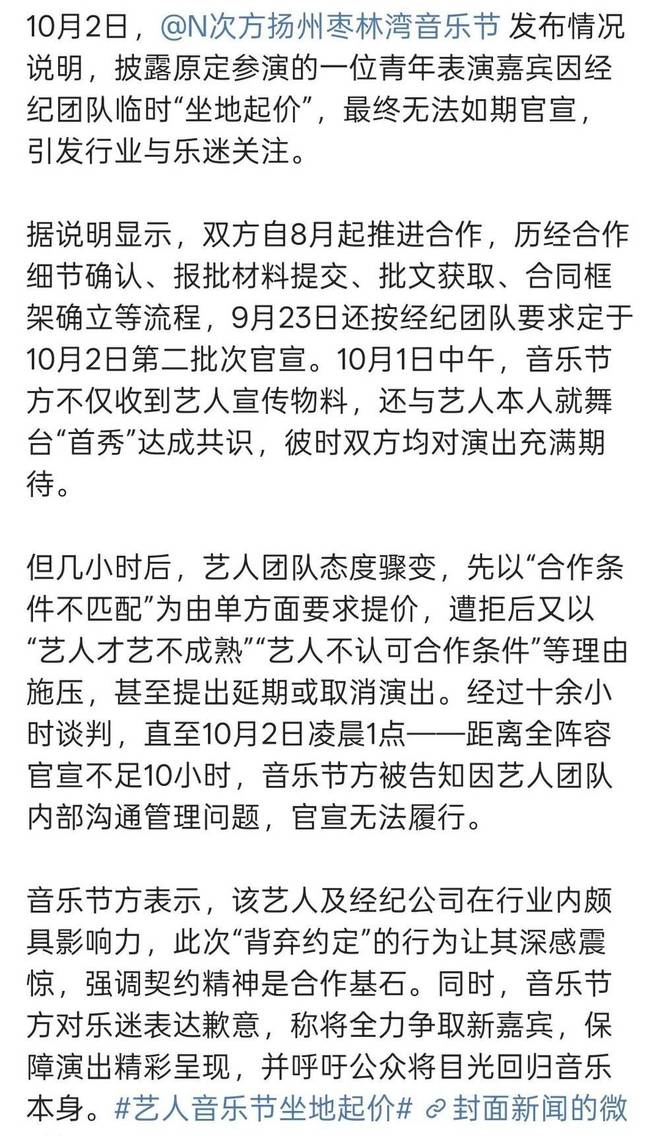 比如10月2日,高位热搜“艺人音乐节坐地起价”事件便是如此。据N次方扬州枣林音乐节发布的声明显示,某青年表演嘉宾团队在首秀演出推进约两个月后,以“合作条件不匹配”为由要求提升合作价格,在被拒绝后又以多理由称如若主办不同意,便只能延期或取消演出。