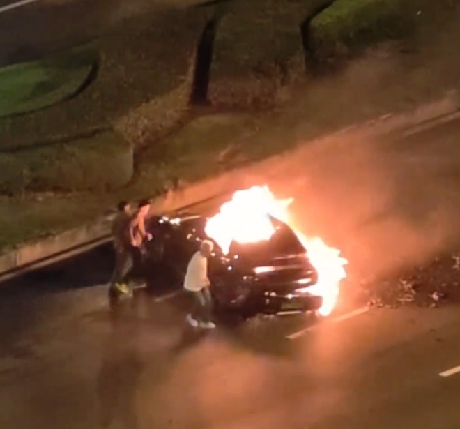 根据流传出的视频可见,多名路人奋力救援,却始终无法打开车门,只能眼睁睁看着火焰吞噬车身。有目击者称,半夜被爆炸声吵醒,听部分其他同路车主说当时车速太快,涉事车辆碰到网约车后飞翻了过来。