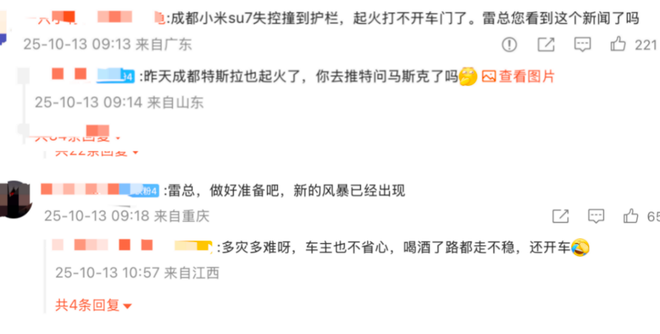 有网友跑到雷军微博下方留言称:“成都小米SU7失控撞到护栏,起火打不开车门了”“做好准备吧,新的风暴已经出现”。