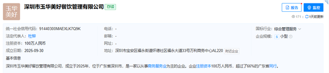 红星资本局10月13日消息,天眼查显示,深圳市玉华美好餐饮管理有限公司(以下简称“玉华美好”)于9月30日成立,注册资本100万元,经营范围涵盖预包装食品销售、预包装食品互联网销售、餐饮服务管理等。