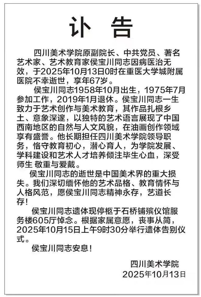 10月13日中午,四川美术学院原副院长、艺术家侯宝川的朋友圈发出了一条简单的讣告——