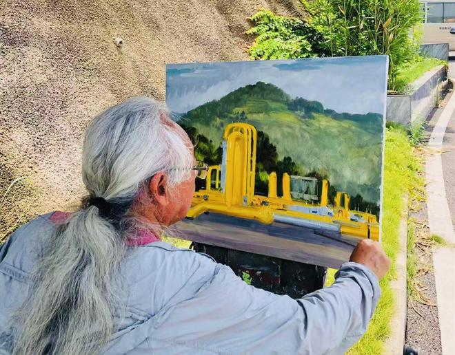 写生现场的侯宝川状态极佳,谈笑风生间,寥寥数笔,便将现代感极强的工业园区管道与川东南的山水风景融合在一起,勾勒成和谐画面。