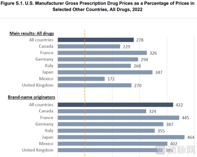 如果区分品牌药与仿制药的话,美国原研品牌药的价格是对比国家价格的422%,差距进一步扩大。