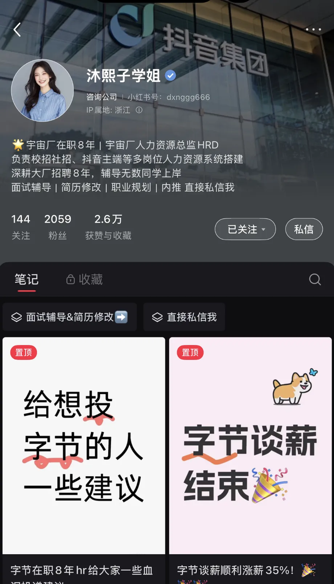 根据受访者提供的资料,该导师在社交平台上的用户名为"字节hr熙熙",个人简介中罗列着诸多光鲜标签:人力资源总监、字节跳动资深人资、八年终面面试官经验、帮助超500人上岸,并负责抖音端多个核心岗位的招聘。