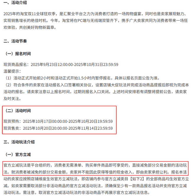 淘宝、天猫的调整力度更为突出,取消了以往多轮预售与现货的复杂模式,将核心玩法聚焦为"官方立减",即消费者无需凑单,购买单件商品即可享受直接减免部分交易金额。