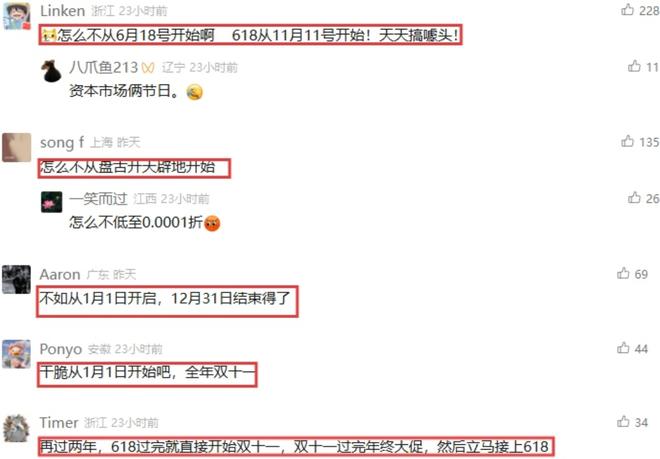"怎么不从6月18日开始,618从11月11日开始!天天搞噱头!""怎么不从盘古开天辟地开始。"