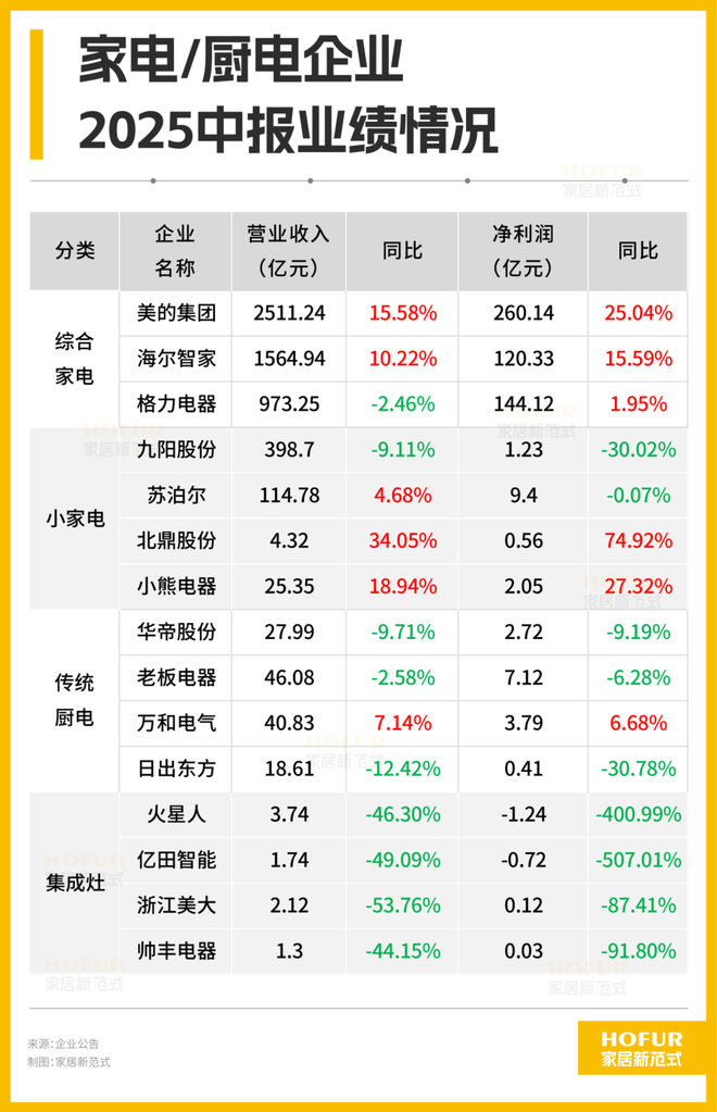 原以为“国补”东风下,家电行业火热一片,但结合2025年业绩中报及近期表现发现,分化趋势正愈发剧烈。一边是综合家电与小家电企业的红红火火,另一边传统厨电与集成灶企业却跌跌不休。美的、海尔等综合巨头凭借“国补”政策、海外市场与智能新品三大引擎逆势增长,而集成灶“四小龙”则集体深陷营收净利双降的泥潭。