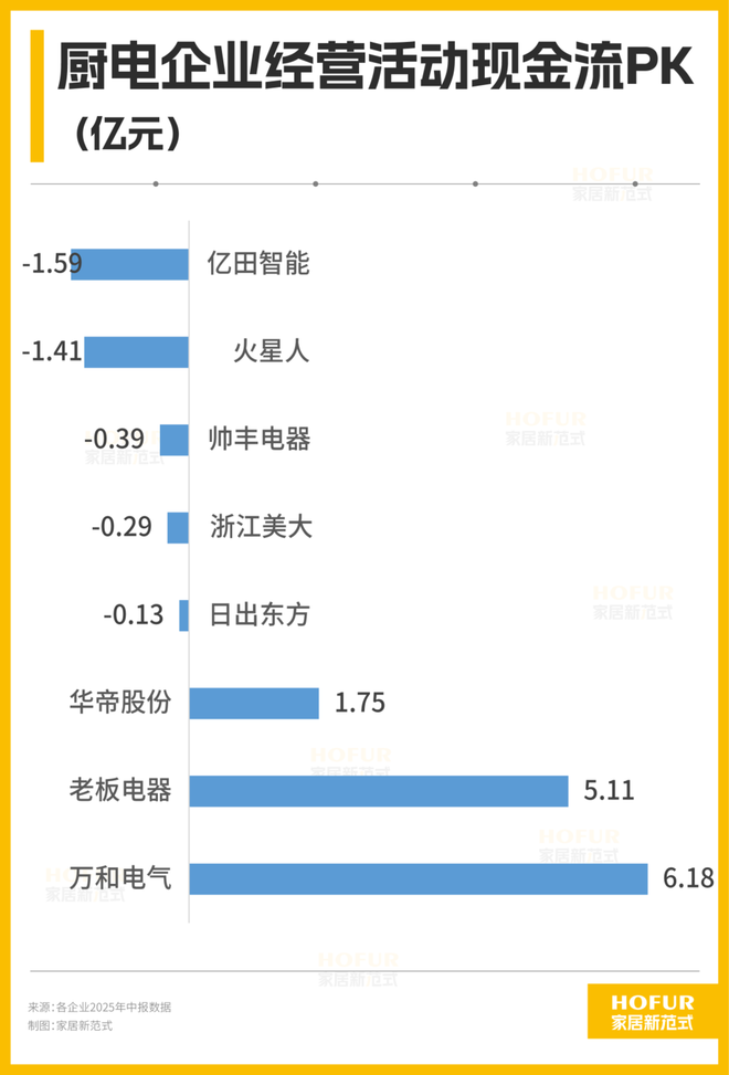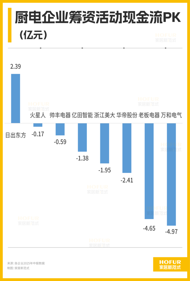 从投资活动现金流来看,几乎所有企业都开始按下“暂停键”,战略收紧,核心动作变成了回笼资金,巩固核心。就连老板电器、华帝股份这样的巨头都在主动大幅收缩投资阵线,走 “高筑墙、广积粮”的谨慎路线。