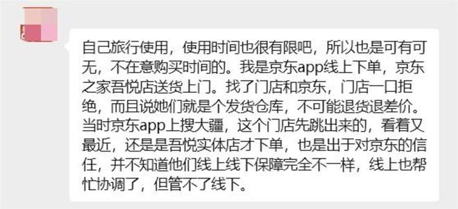 “门店一口拒绝,而且说她们就是个发货仓库,不可能退货退差价。”李露露表示,之后她又尝试通过京东线上平台协调,可得到的回复是线上管不了线下店。