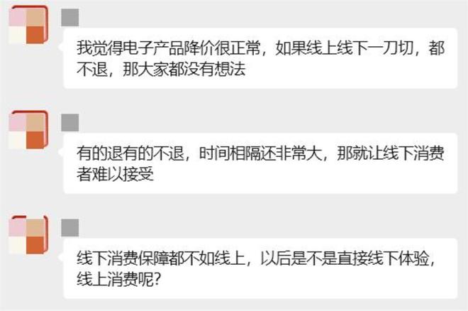 “有的退有的不退,时间相隔还非常大,那就让线下消费者难以接受。”李露露坦言,电子产品降价本身是正常市场现象,如果线上线下能统一政策,大家或许不会有太多想法,但这种“同品不同权”的情况,让线下消费者感觉受到了不公平对待,“线下消费保障都不如线上,以后是不是直接线下体验,线上消费呢?”
