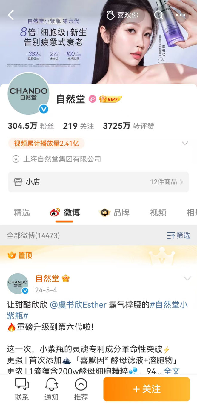 在8月29日,自然堂推迟了原定由虞书欣出席的直播活动,此后一个多月时间里,其官方微博未再更新与虞书欣有关的新物料,但目前其微博置顶物料,依旧为虞书欣相关。