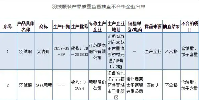 时间拉回2019年四季度,江苏省市场监管局的抽查中,鸭鸭一款女式连帽羽绒服就因含绒量、绒子含量不达标登上不合格名单。