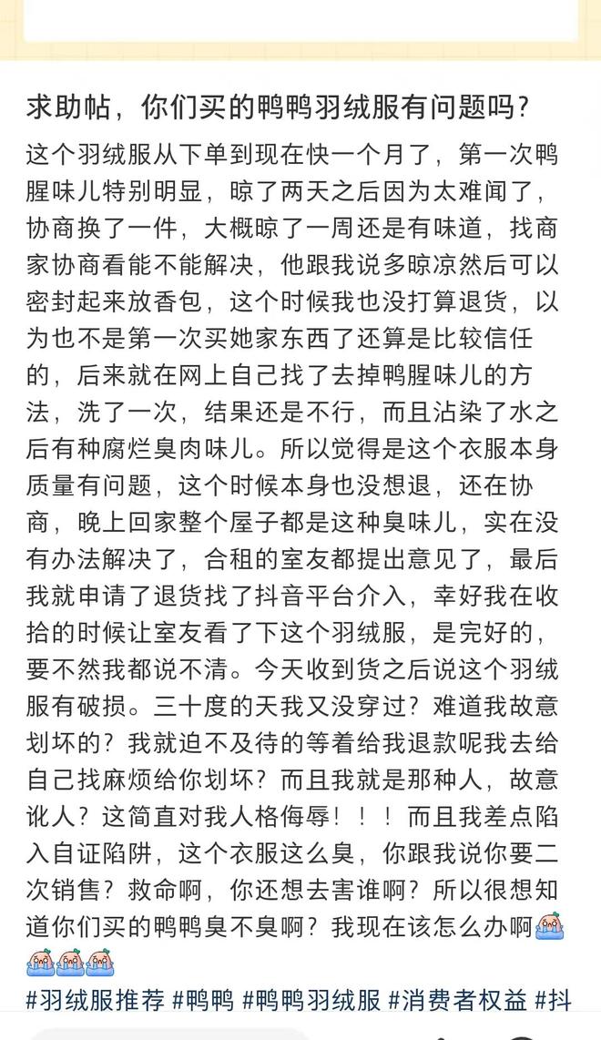虽说羽绒服初期可能带点鸭绒天然的味道,但味道重到影响穿着,往往是清洗不彻底、绒子等级低或是存储不当的信号,这难免让消费者对品控打上问号。