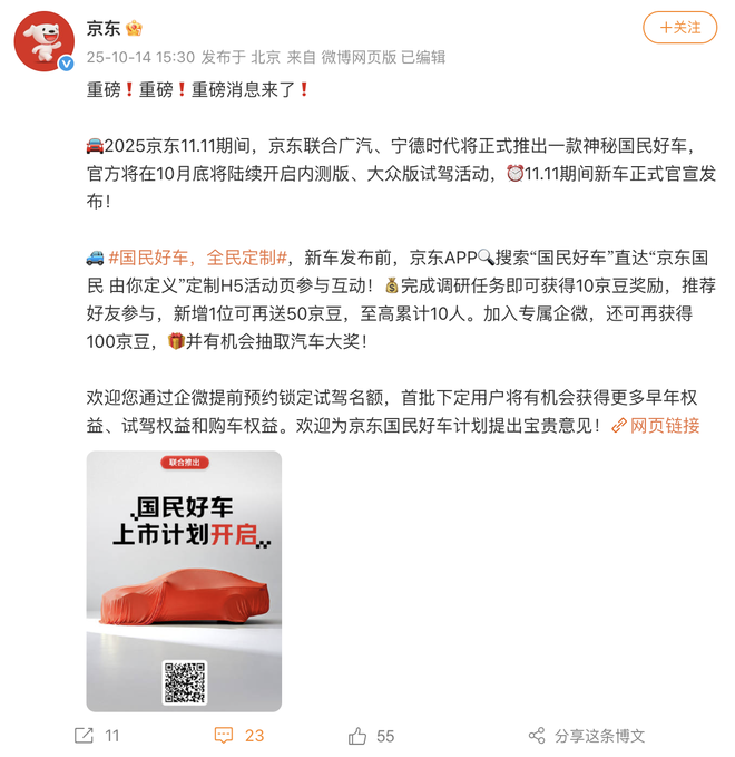 据《科创板日报》报道,该款新车是三方联合推出,京东主要提供用户消费洞察和独家销售,不直接涉及制造环节。