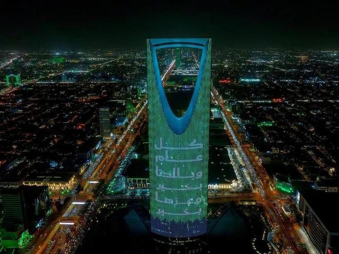 国庆节当天,在利雅得,天际线被绿色和白色照亮,标志性建筑和纪念碑展示了沙特国旗的颜色。
