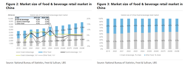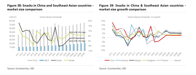 报告指出,2024年中国零食市场规模已达1.1万亿人民币。然而,瑞银预测,在2024年至2027年期间,整个行业的销售额年均复合增长率(CAGR)将放缓至2-3%。