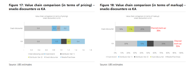 供应链优化与成本优势: 零食折扣店通过直接向上游生产商采购,大幅缩短了传统零售的价值链(零食生产商/品牌商—经销商—零售商),从而提高了渠道效率,并能以更具竞争力的价格销售产品。瑞银分析师预计,零食折扣店渠道的定价相较于传统大型连锁超市(KA)渠道可低25%。