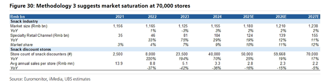 零食折扣店是当前市场的主要增长引擎。该渠道在2019-2024年间实现了38%的惊人年均复合增长率。门店数量已激增至4.5万家,即便如此,该行认为市场远未饱和,预计门店总数天花板可达7万家以上。