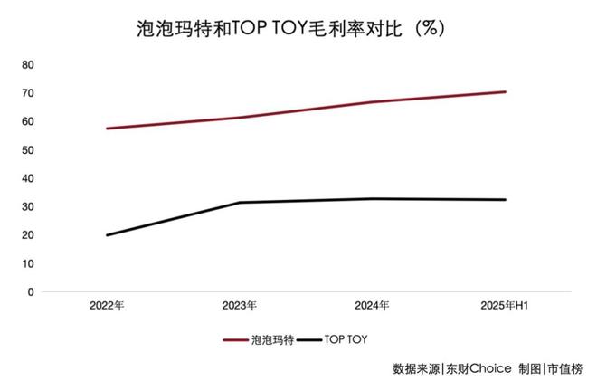 2025年上半年,泡泡玛特的毛利率高达70.3%,远高于TOP TOY的32.4%。