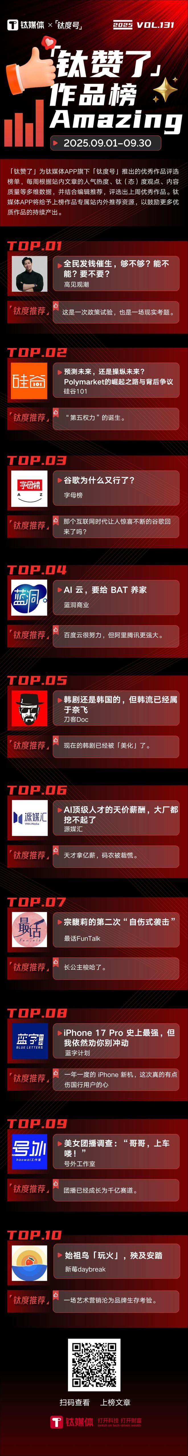 2025年9月1日—2025年9月30日,「钛赞了」榜单第131期上榜作品为: