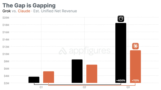 根据 Appfigures 的统计,Grok 的第三季度的移动端收入已达到 1850 万美元,较第一季度增长 400%,增长幅度遥遥领先一众 AI 应用。Appfigures 称 Imagine 功能助推显著。