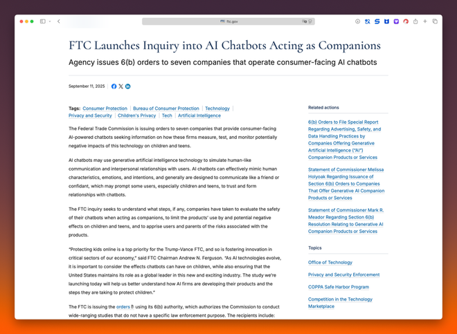 美联邦贸易委员会(FTC)9 月开始对 OpenAI、Alphabet、Meta 等 7 家科技公司展开调查,以评估 AI 聊天机器人对儿童和青少年的潜在负面影响。FTC 认为,AI 聊天机器人通常被设计得能够像朋友一样交流,可能会导致儿童及青少年与聊天机器人建立情感依赖。