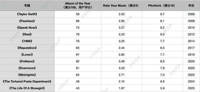 若将时间线拉长便会发现,自2022年的《Midnights》开始,尽管其商业成绩屡创新高,但在核心乐迷社群和乐评网站中的声誉却在悄然下行。