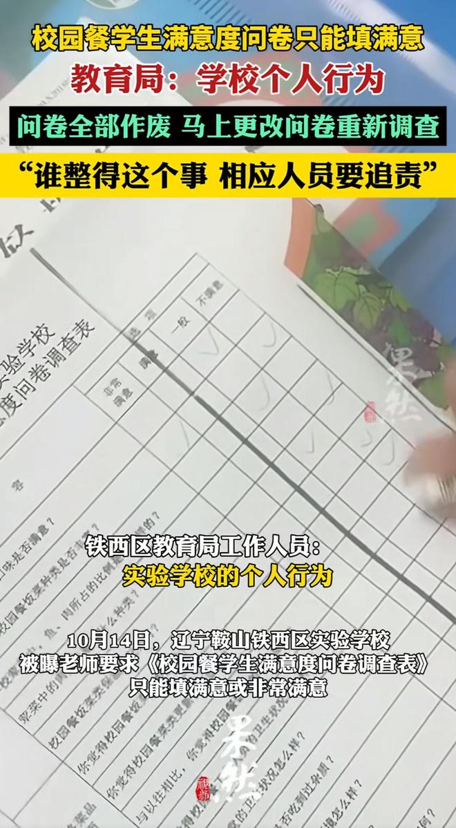 校园餐问卷也有“标准答案”?据齐鲁晚报果然视频报道,近日鞍山铁西区实验学校被曝老师要求学生填《校园餐学生满意度问卷调查表》,只能填“非常满意”或“满意”,学生用橡皮擦将选了一般和不满意的都擦掉。