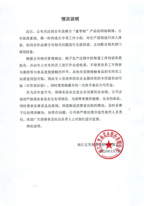 面对质疑,五芳斋在官网发布了一份情况说明,内容大致是 “已第一时间成立专项小组,对涉事产品的生产流程进行全面排查,同时协同来伊份开展核查工作”。