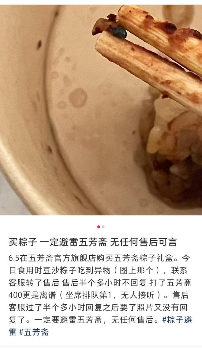 在社交平台上,关于五芳斋粽子的负面反馈不在少数,消费者的投诉几乎都指向了“肉眼可见的异物”,每一条都让人倒胃口。