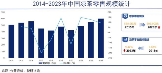 数据是直观清晰的。根据智研咨询发布的《2024—2030年中国凉茶行业市场需求分析及投资方向研究报告》,自从2016年之后,中国凉茶零售规模就开启了上上下下的震荡模式。而从2014年—2023年的总体规模来看,十年来增幅约在20%左右,明显已经进入了增长停滞区间。