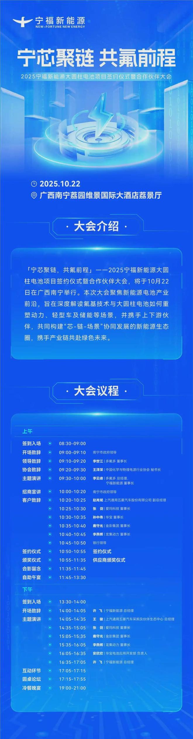 为了联合更多力量,10月22日在广西南宁,多氟多将携手36氪举办一场主题为“宁芯聚链,共氟前程”的峰会。在会议现场,宁福新能源大圆柱电池项目签约仪式将正式举行,启动新一轮产业布局。